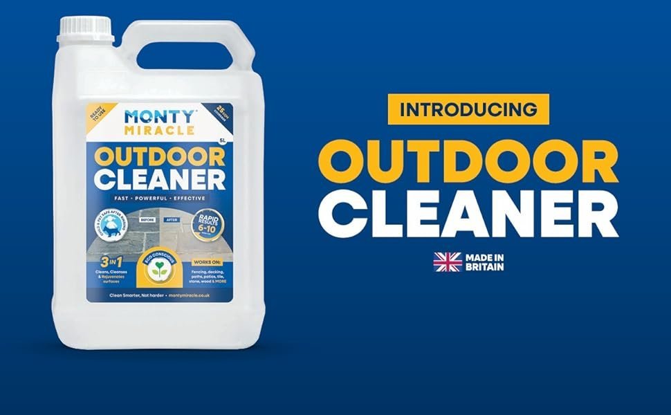 Monty Miracle Patio Cleaner is quite simply the fastest hard surface external cleaner on the market. Our solution is ready to go so no need to mix or dilute, everything has been taken care of already. Simply apply Monty Cleaner to any outdoor area you’d like to clean, agitate with a soft bristle brush, leave for 6-10 mins, then rinse of with water, Job done! Forget the hassle of pressure washing, our method will save you time, money and effort. No Mess, No Noise and No Fuss! Keep safe all year round by using Monty Cleaner for a slip-free garden. Try our Monty Sealer to protect you for up to ten years! 5L of Monty Cleaner Covers up to 25 sq m. Our Patented Formula is proudly made in the UK. Done Without The Need For Damaging Pressure Washing within 10 Minutes, The Most Powerful Outdoor Cleaner, Kind To Surfaces & Eco-conscious. We’ve Got You Covered. Monty Miracle has created simply the best outdoor patio cleaner, eliminating the need for aggressive methods. Monty Cleaner can be used on: Brick & Block Paving, Natural & Indian Stone, Tarmac & Concrete, Fencing & Decking, Artificial Stone, Roof tiles & Slates, Canopies & Shelters, Ornamental Ceramics, Plastic, Wood & Coated Metals, K Rend, Render and Pretty Much Anything You Can See Outside. Monty Patio Cleaner can be stored for up to 18 months.